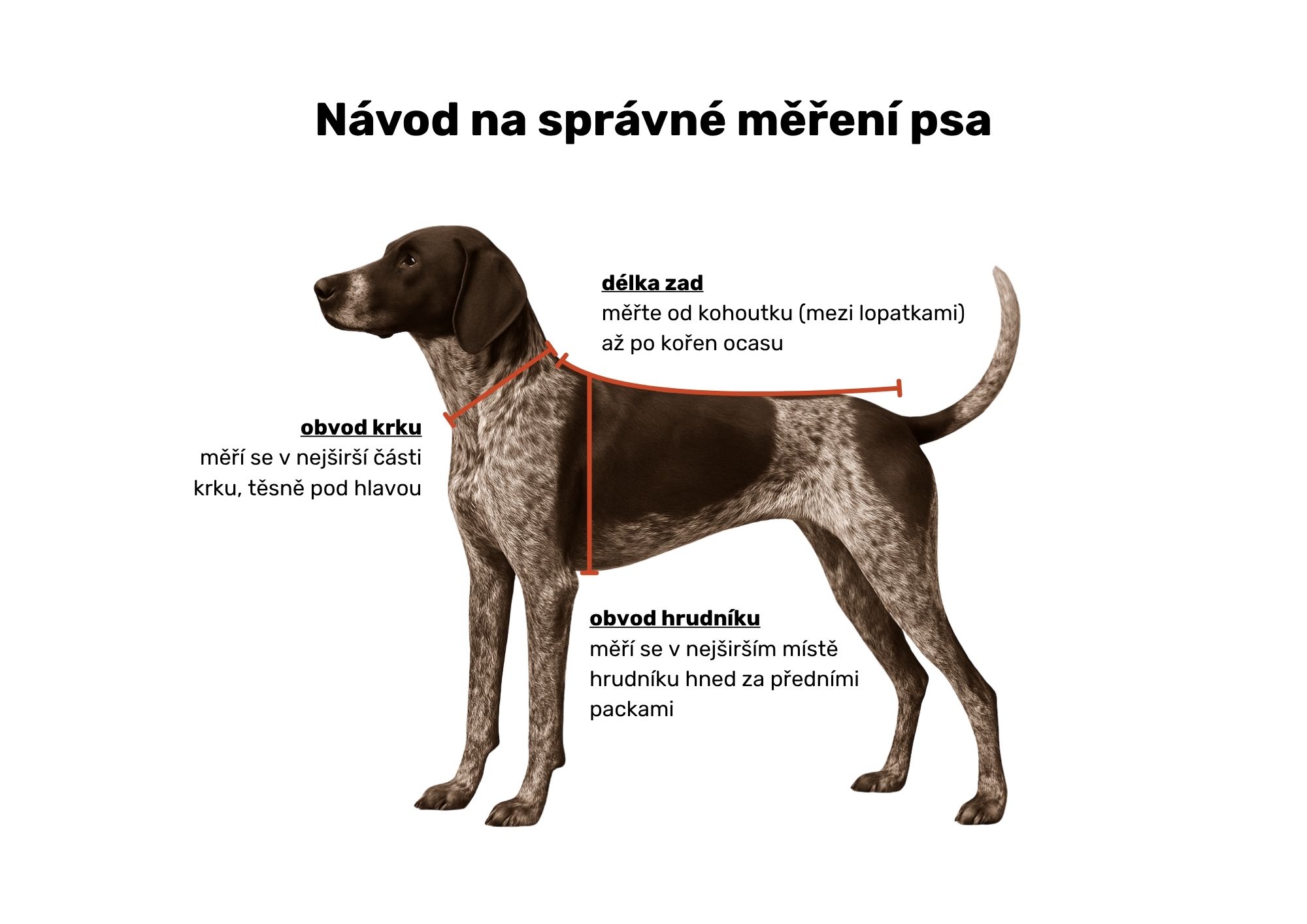 Měřte od kohoutku (nejvyšší místo mezi lopatkami) až po kořen ocasu. Tento rozměr je klíčový zejména u oblečků – díky němu padnou přesně, zakryjí hřbet psa a zároveň mu nebudou překážet při chůzi, běhu nebo hře.