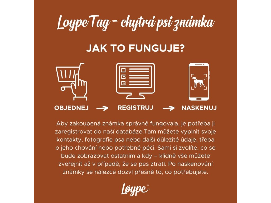 Loype Tag Basic je chytrá psí známka s unikátním QR kódem a doživotní registrací zdarma. Po naskenování QR kódu získá nálezce okamžitě přístup k důležitým údajům – telefonnímu číslu, adrese, zdravotním informacím i datu posledního očkování.