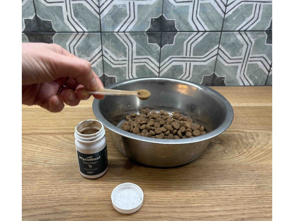 Prášek lze jednoduše zamíchat do běžného krmiva, konzervy nebo do trochy ochucené vody. Má lehce nahořklou chuť, což je u medicinálních hub přirozené. Přípravek je vhodný i pro dlouhodobé podávání.