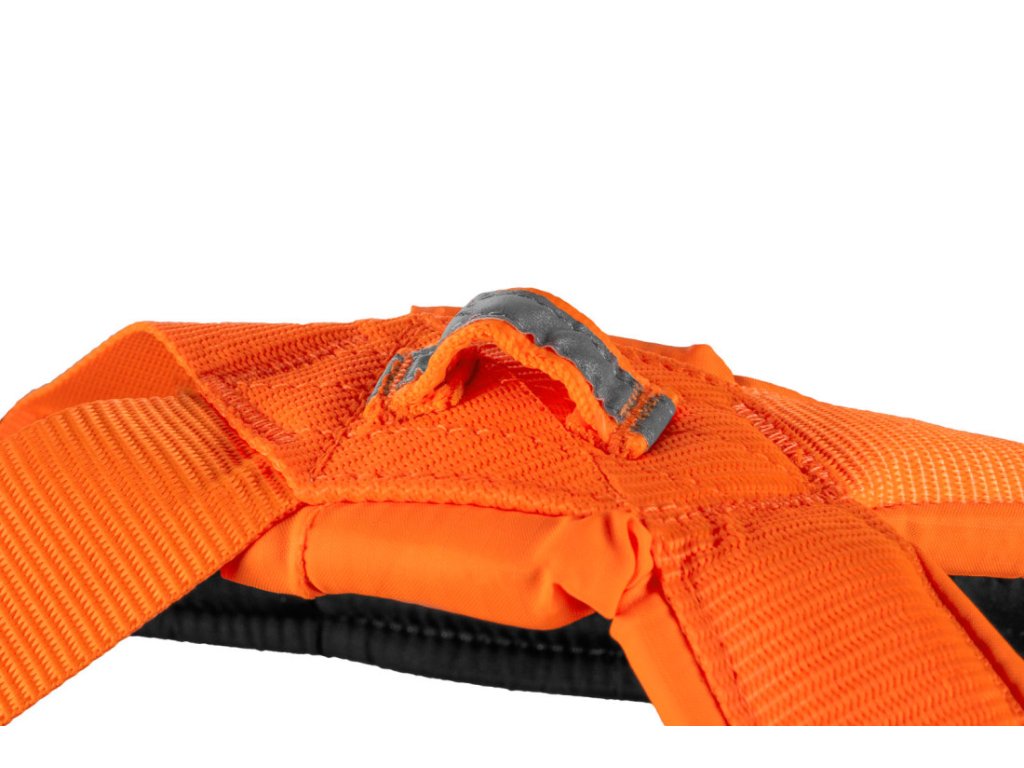 - Reflexní poutko na zádech poskytuje lepší viditelnost za špatného počasí nebo ve tmě, a lze na něj připevnit světlo (není součástí postroje)