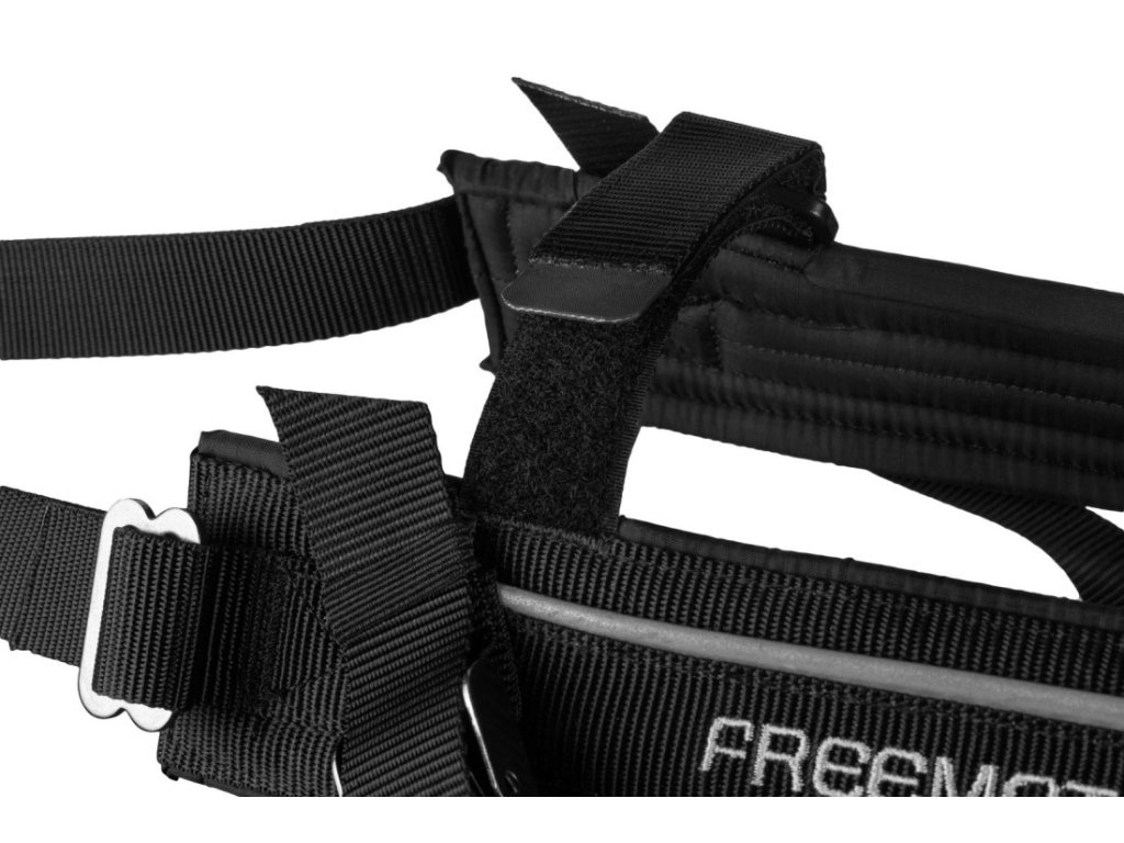 - Zadní popruh pro nastavování délky postroje je z lehčího materiálu, což usnadňuje nastavení