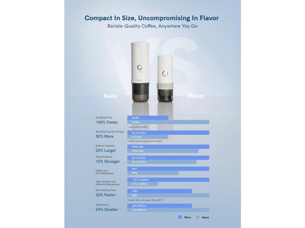 Outin je značka zaměřená na přenosné espresso kávovary, které umožňují rychlou a snadnou přípravu kvalitního espressa kdekoliv. Jejich Outin Nano s 20 bary tlaku a vestavěnou baterií zvládne připravit horké espresso během pár minut, a to s použitím jak kapslí, tak mleté kávy. Je ideální pro cestování a venkovní aktivity.