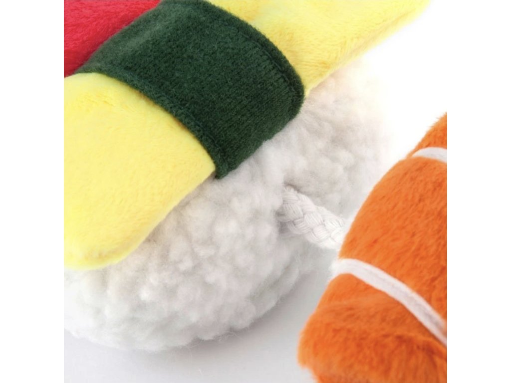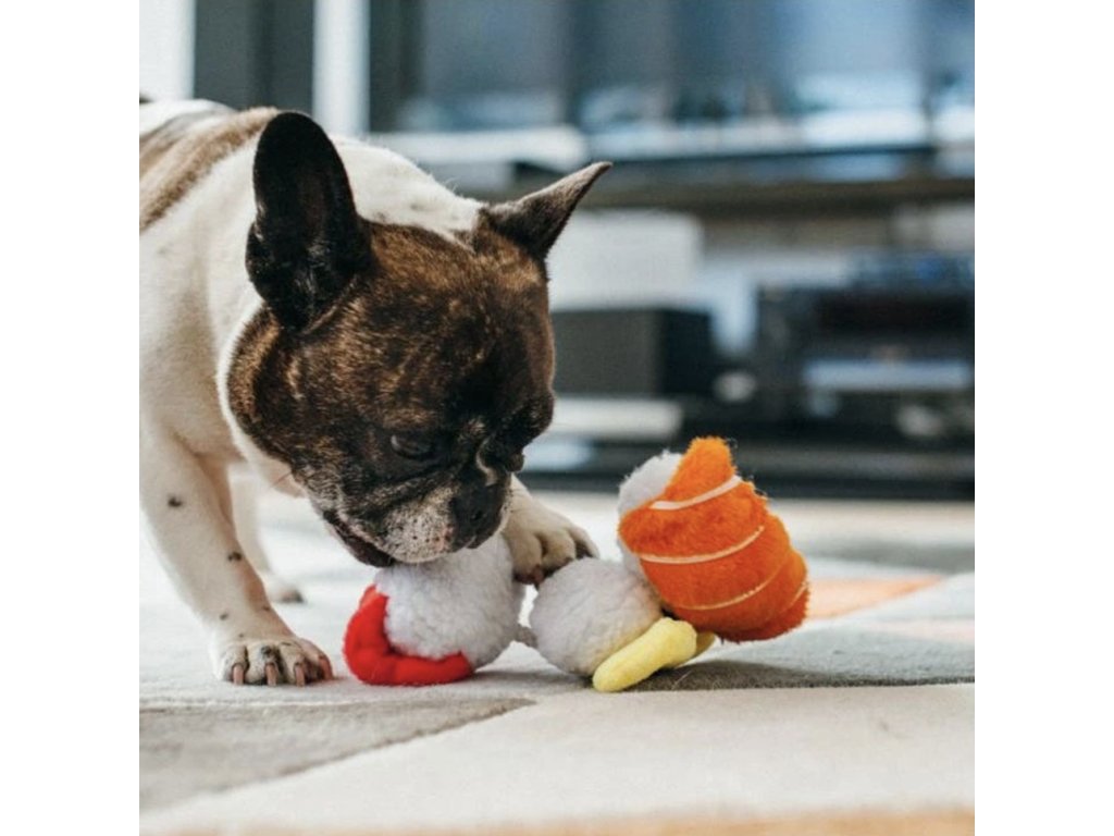 Hračka má dvouvrstvý potah a zesílené šití, které zvládne i pořádné kousání. Uvnitř je pískátko a výplň z recyklovaných PET lahví s certifikací bezpečnosti. Po degustaci můžete hodit do pračky i sušičky.