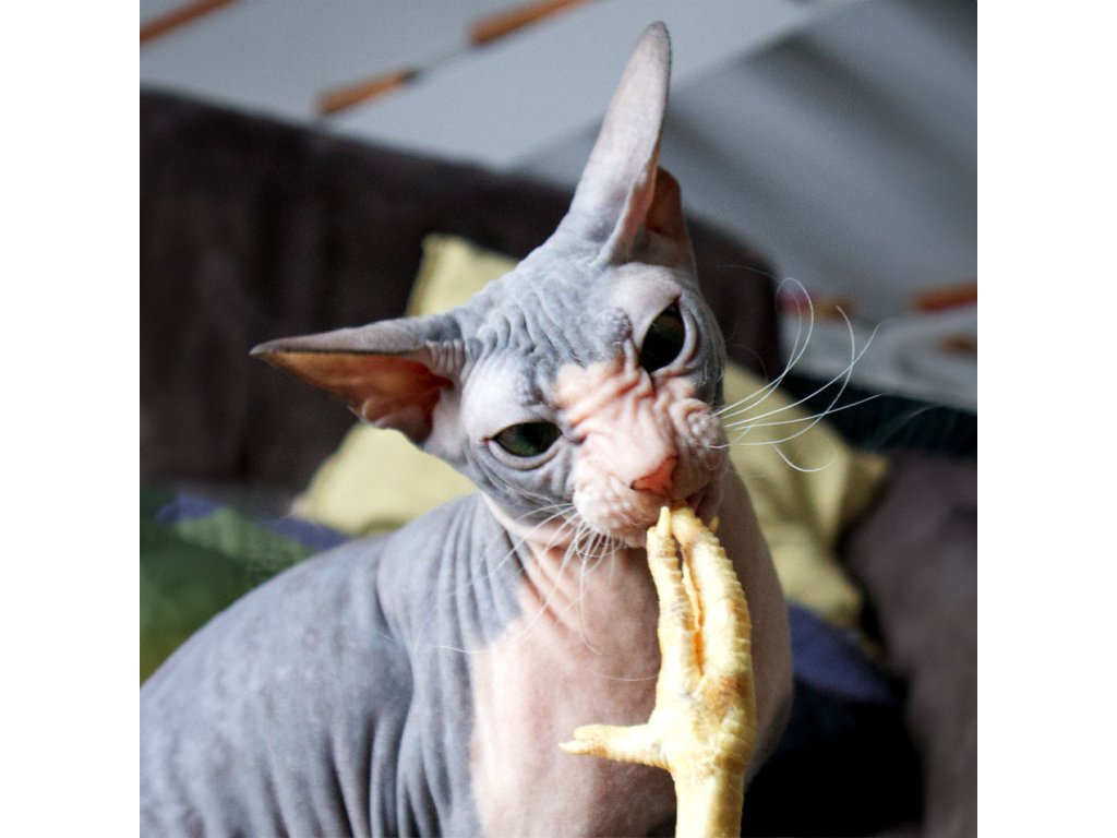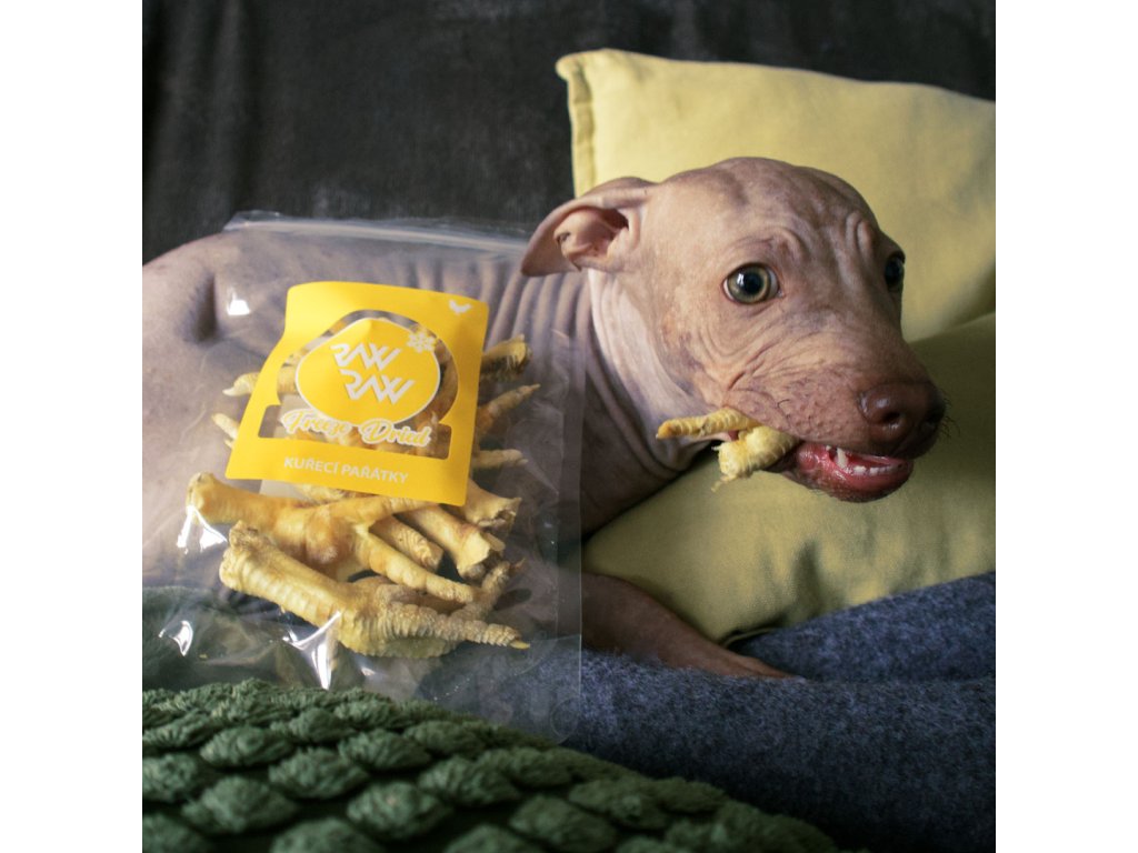 Přírodní pamlsek z kuřecích pařátků sušených mrazem, který čistí zuby a dodává kolagen pro zdravé klouby.