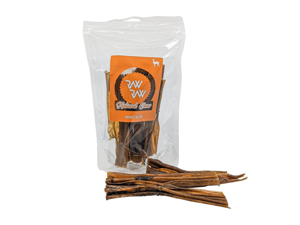 Přírodní sušená srnčí kůže, hypoalergenní žvýkací pamlsek pro psy bez obilovin, lepku a chemických přísad. Zdroj vápníku a kolagenu, podporuje čištění zubů a zdravé trávení. Vhodné pro BARF.