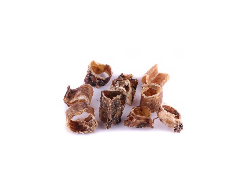 Sušený hovězí hrtan (také trachea) nakrájený na menší kroužky (cca 4-6 cm) se snadno dávkuje a potěší každého psa. Obsahuje vysoký podíl kolagenu a elastinu, které přirozeně podporují zdravé klouby, šlachy a vazy. Díky minerálům prospívá také kostem a zubům. Je přirozeně mastnější, a právě proto psům tak chutná.