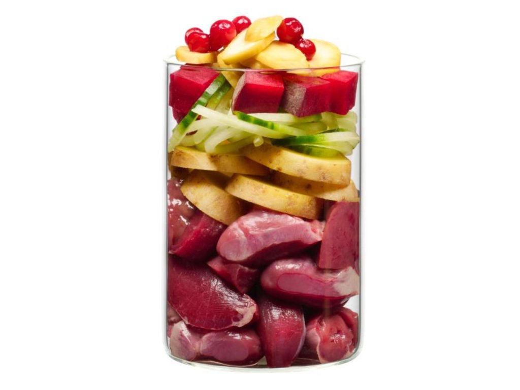 Složení: krůtí žaludky 30 %, krůtí srdce 8,5 %, krůtí játra 8,5 %, mrkev, brambory 8,5 %, dýně, okurka, červená řepa, kokosová mouka 2,5 %, brusinka 1 %, kaštan 1 %, řepkový olej, strouhaný kokos, skořápka ústřice, tymián*, kerblík*, kardamom*, anýz*, minerální jíl, šípek*, minerální látky.